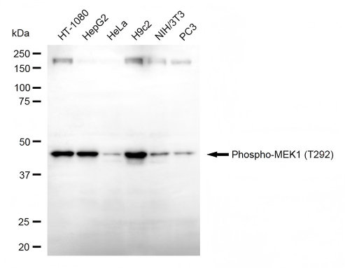 • Western blotting analysis using phospho-MEK1 (T292) antibody. Total cell lysates (30 μg) from various cell lines were loaded and separated by SDS-PAGE. The blot was incubated with phospho-MEK1 (T292) antibody and HRP-conjugated goat anti-rabbit secondary antibody respectively.