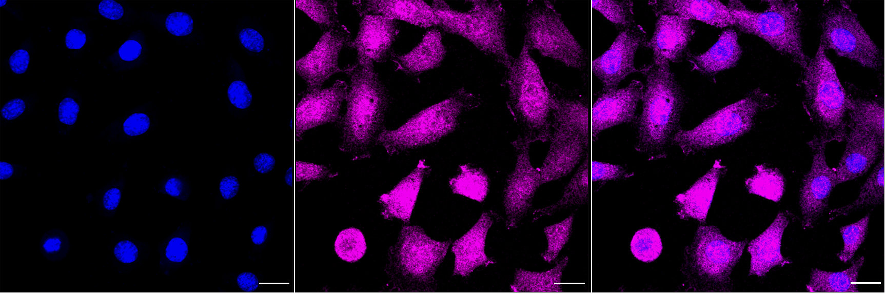Immunocytochemical staining of C2C12 cells with MAP2K3 antibody. Nuclei were stained blue with DAPI; MAP2K3 was stained magenta with Alexa Fluor® 647. Images were taken using Leica stellaris 5. Protein abundance based on laser Intensity and smart gain: Medium. Scale bar, 20 μm.