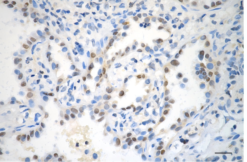 Immunohistochemistry was performed on paraffin-embedded human lung adenocarcinoma using MAP2K3 antibody. Antigen retrieval was done in sodium citrate buffer (pH 6.0). DAB was used for detection, with hematoxylin counterstaining. Images were acquired using a Nikon Ci-L Plus microscope (40× objective). Scale bar: 25 μm.