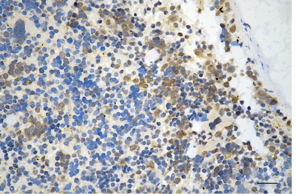 Immunohistochemistry was performed on paraffin-embedded mouse spleen using MAP2K3 antibody. Antigen retrieval was done in sodium citrate buffer (pH 6.0). DAB was used for detection, with hematoxylin counterstaining. Images were acquired using a Nikon Ci-L Plus microscope (40× objective). Scale bar: 25 μm.