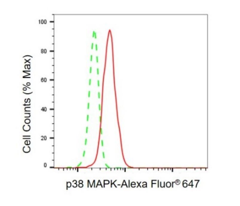 • Flow cytometric analysis of p38 MAPK expression in HeLa cells using p38 MAPK antibody. Green, isotype control; red, p38 MAPK.