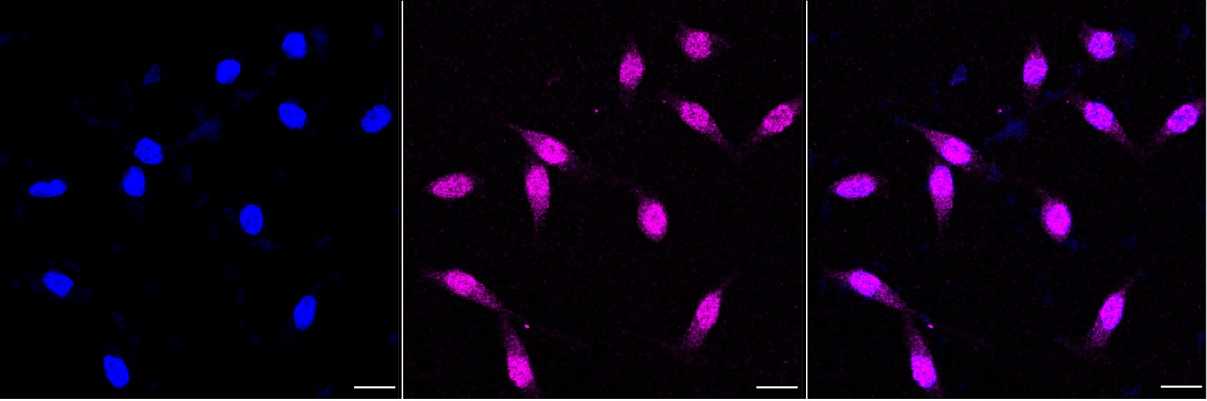 • Immunocytochemical staining of Hela cells with p38 MAPK antibody. Nuclei were stained blue with DAPI; p38 MAPK was stained magenta with Alexa Fluor® 647. Images were taken using Leica stellaris 5. Protein abundance based on laser Intensity and smart gain: Medium. Scale bar, 20 μm.