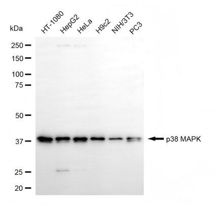 • Western blotting analysis using p38 MAPK antibody. Total cell lysates (30 μg) from various cell lines were loaded and separated by SDS-PAGE. The blot was incubated with p38 MAPK antibody and HRP-conjugated goat anti-rabbit secondary antibody respectively.