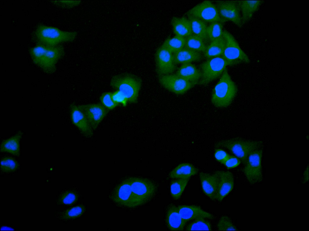 Immunofluorescence staining of Hela cell with CSB-RA148565A0HU at 1:50 , counter-stained with DAPI. The cells were fixed in 4% formaldehyde, permeabilized using 0.2% Triton X-100 and blocked in 10% normal Goat Serum. The cells were then incubated with the antibody overnight at 4°C. The secondary antibody was Alexa Fluor 488-congugated AffiniPure Goat Anti-Rabbit IgG(H+L).