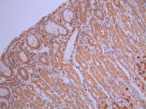 IHC image of CSB-RA148565A0HU diluted at 1:100 and staining in paraffin-embedded human stomach tissue performed on a Leica BondTM system. After dewaxing and hydration, antigen retrieval was mediated by high pressure in a citrate buffer (pH 6.0). Section was blocked with 10% normal goat serum 30min at RT. Then primary antibody (1% BSA) was incubated at 4°C overnight. The primary is detected by a Goat anti-rabbit polymer IgG labeled by HRP and visualized using 0.05% DAB.