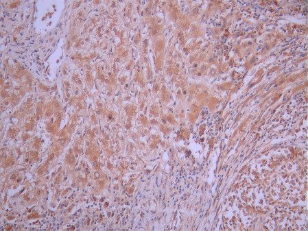 IHC image of CSB-RA148565A0HU diluted at 1:100 and staining in paraffin-embedded human liver cancer performed on a Leica BondTM system. After dewaxing and hydration, antigen retrieval was mediated by high pressure in a citrate buffer (pH 6.0). Section was blocked with 10% normal goat serum 30min at RT. Then primary antibody (1% BSA) was incubated at 4°C overnight. The primary is detected by a Goat anti-rabbit polymer IgG labeled by HRP and visualized using 0.05% DAB.