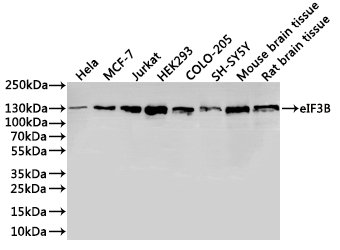 Positive WB detected in:Hela whole cell lysate(30µg), MCF-7 whole cell lysate(30µg), Jurkat whole cell lysate(30µg), HEK293 whole cell lysate(30µg), COLO-205 whole cell lysate(30µg), SH-SY5Y whole cell lysate(30µg), Mouse brain tissue lysate(30µg), Rat brain tissue lysate(30µg)