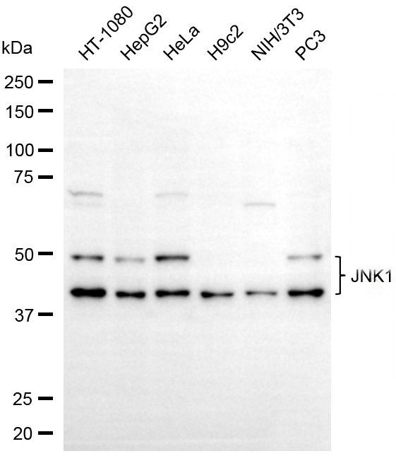 • Western blotting analysis using JNK1 antibody. Total cell lysates (30 μg) from various cell lines were loaded and separated by SDS-PAGE. The blot was incubated with JNK1 antibody and HRP-conjugated goat anti-rabbit secondary antibody respectively.