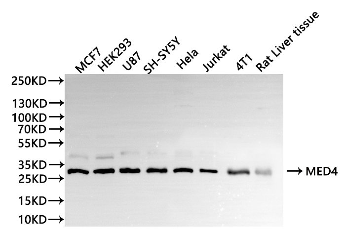 Activator-recruited cofactor 36 kDa component antibody; ARC36 antibody; DRIP36 antibody; FLJ10956 antibody; HSPC126 antibody; med4 antibody; MED4_HUMAN antibody; Mediator complex subunit 4 antibody; Mediator of RNA polymerase II transcription subunit 4 antibody; Mediator of RNA polymerase II transcription, subunit 4 homolog antibody; OTTHUMP00000018390 antibody; OTTHUMP00000018391 antibody; OTTHUMP00000018392 antibody; RP11-90M2.2 antibody; TRAP/SMCC/PC2 subunit p36 subunit antibody; TRAP36 antibody; VDRIP antibody; Vitamin D3 receptor-interacting protein complex 36 kDa component antibody