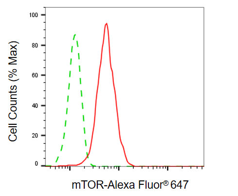 • Flow cytometric analysis of mTOR expression in HepG2 cells using mTOR antibody. Green, isotype control; red, mTOR.