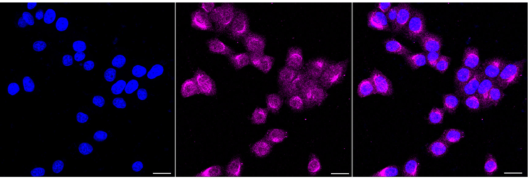 • Immunocytochemical staining of HepG2 cells with mTOR antibody. Nuclei were stained blue with DAPI; mTOR was stained magenta with Alexa Fluor® 647. Images were taken using Leica stellaris 5. Protein abundance based on laser Intensity and smart gain: High. Scale bar, 20 μm.