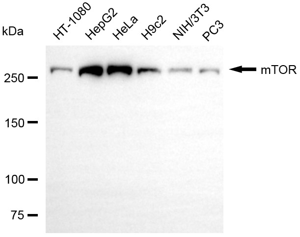 • Western blotting analysis using mTOR antibody. Total cell lysates (30 μg) from various cell lines were loaded and separated by SDS-PAGE. The blot was incubated with mTOR antibody and HRP-conjugated goat anti-rabbit secondary antibody respectively.