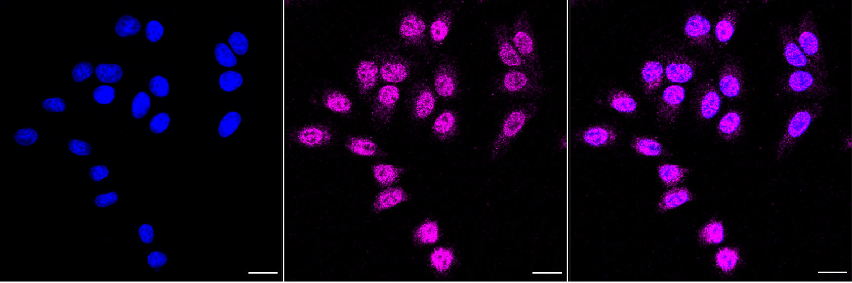 • Immunocytochemical staining of HepG2 cells with mTOR antibody. Nuclei were stained blue with DAPI; mTOR was stained magenta with Alexa Fluor® 647. Images were taken using Leica stellaris 5. Protein abundance based on laser Intensity and smart gain: Medium. Scale bar, 20 μm.