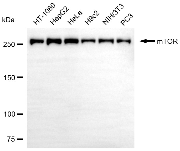 • Western blotting analysis using mTOR antibody. Total cell lysates (30 μg) from various cell lines were loaded and separated by SDS-PAGE. The blot was incubated with mTOR antibody and HRP-conjugated goat anti-rabbit secondary antibody respectively.