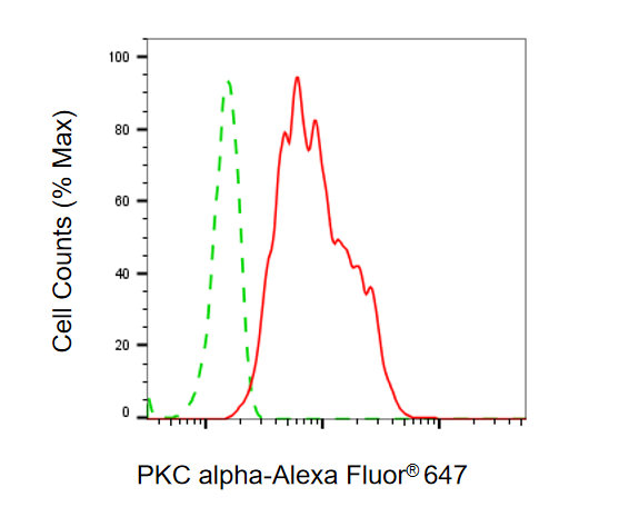 • Flow cytometric analysis of PKC alpha expression in HT-1080 cells using PKC alpha antibody. Green, isotype control; red, PKC alpha.