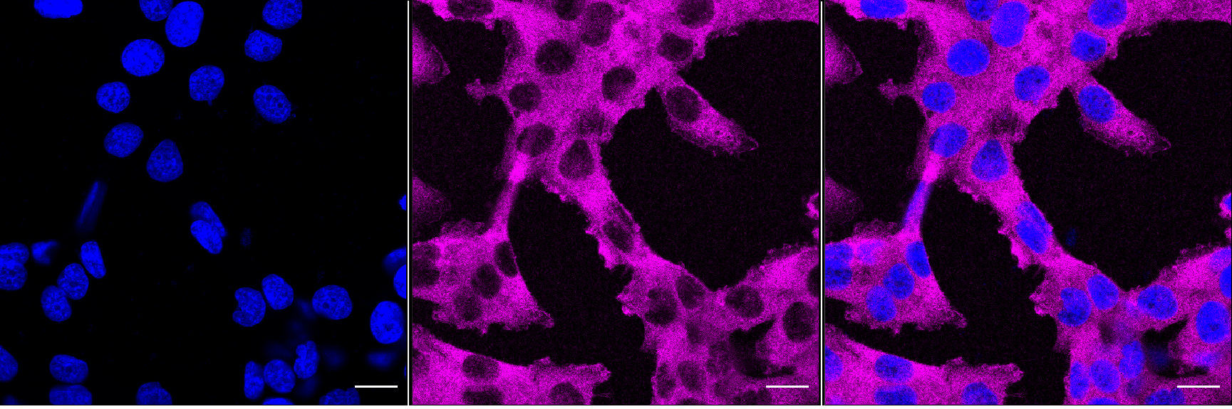 • Immunocytochemical staining of HT-1080 cells with PKC alpha antibody. Nuclei were stained blue with DAPI; PKC alpha was stained magenta with Alexa Fluor® 647. Images were taken using Leica stellaris 5. Protein abundance based on laser Intensity and smart gain: Medium. Scale bar, 20 μm.