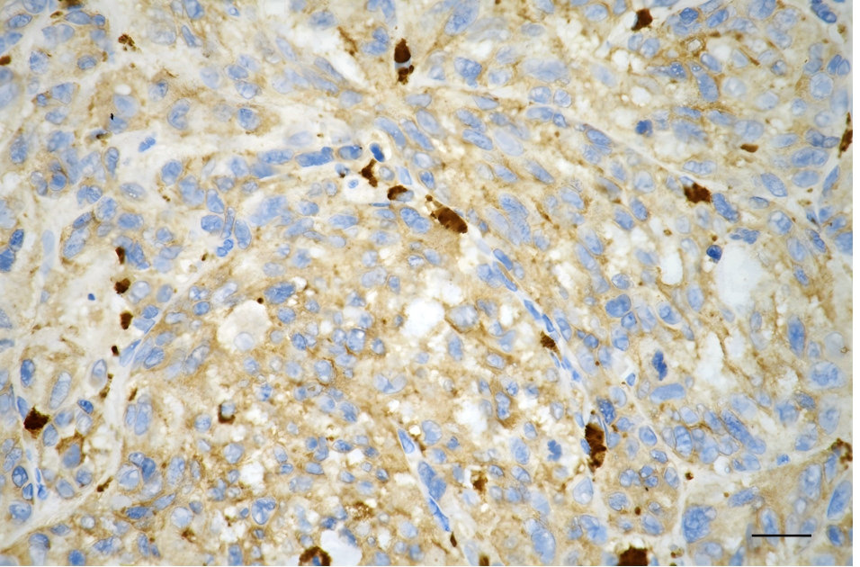 • Immunohistochemistry was performed on paraffin-embedded human glioblastoma using PKC alpha antibody. Antigen retrieval was done in sodium citrate buffer (pH 6.0). DAB was used for detection, with hematoxylin counterstaining. Images were acquired using a Nikon Ci-L Plus microscope (40× objective). Scale bar: 25 μm.