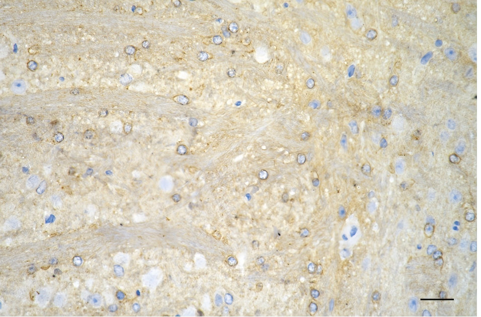 • Immunohistochemistry was performed on paraffin-embedded mouse brain using PKC alpha antibody. Antigen retrieval was done in sodium citrate buffer (pH 6.0). DAB was used for detection, with hematoxylin counterstaining. Images were acquired using a Nikon Ci-L Plus microscope (40× objective). Scale bar: 25 μm.