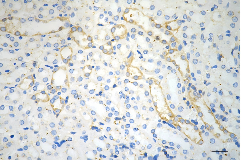 • Immunohistochemistry was performed on paraffin-embedded mouse kidney using PKC alpha antibody. Antigen retrieval was done in sodium citrate buffer (pH 6.0). DAB was used for detection, with hematoxylin counterstaining. Images were acquired using a Nikon Ci-L Plus microscope (40× objective). Scale bar: 25 μm.