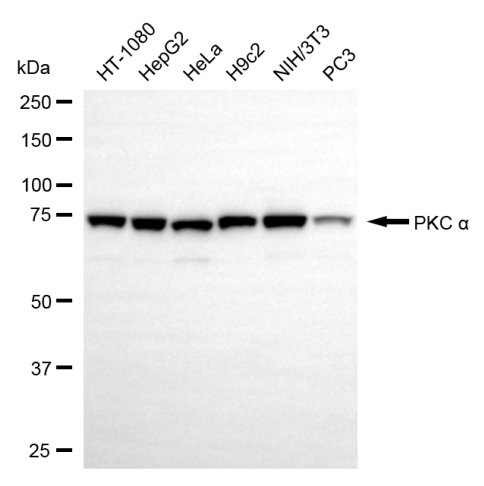 • Western blotting analysis using PKC alpha antibody. Total cell lysates (30 μg) from various cell lines were loaded and separated by SDS-PAGE. The blot was incubated with PKC alpha antibody and HRP-conjugated goat anti-rabbit secondary antibody respectively.