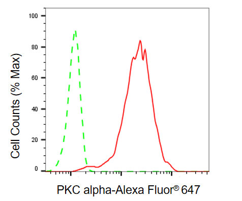 • Flow cytometric analysis of PKC alpha expression in HepG2 cells using PKC alpha antibody. Green, isotype control; red, PKC alpha.