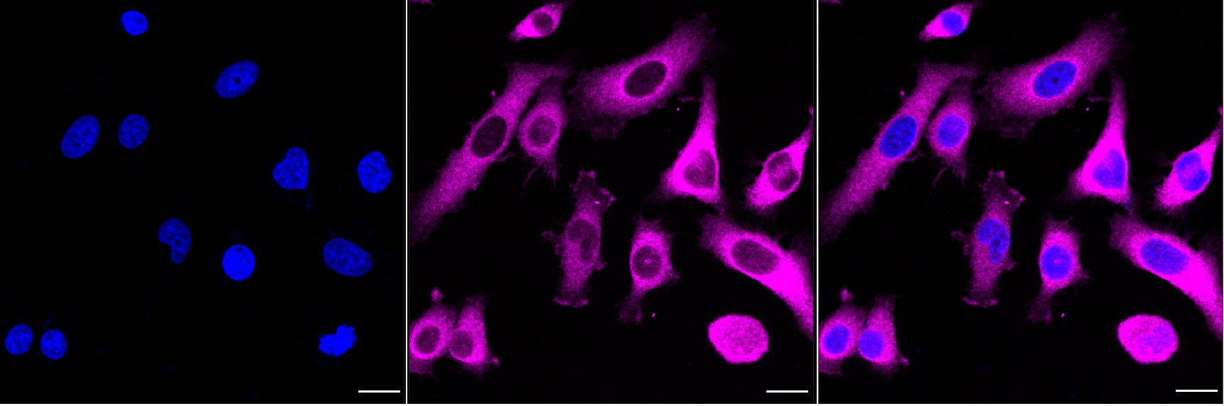 • Immunocytochemical staining of HepG2 cells with PKC alpha antibody. Nuclei were stained blue with DAPI; PKC alpha was stained magenta with Alexa Fluor® 647. Images were taken using Leica stellaris 5. Protein abundance based on laser Intensity and smart gain: Medium. Scale bar, 20 μm.