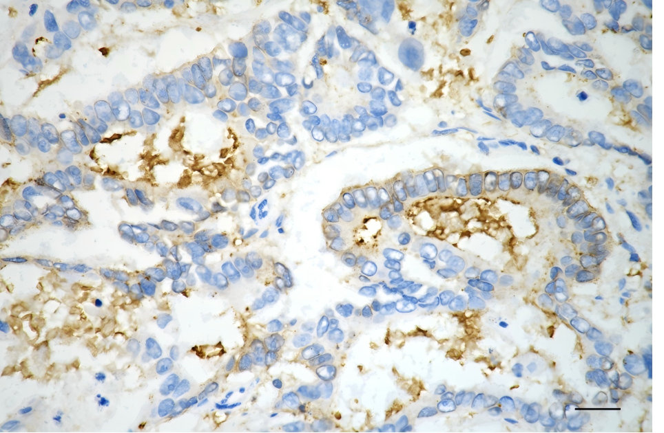 • Immunohistochemistry was performed on paraffin-embedded human sigmoid colon carcinoma using PKC alpha antibody. Antigen retrieval was done in sodium citrate buffer (pH 6.0). DAB was used for detection, with hematoxylin counterstaining. Images were acquired using a Nikon Ci-L Plus microscope (40× objective). Scale bar: 25 μm.