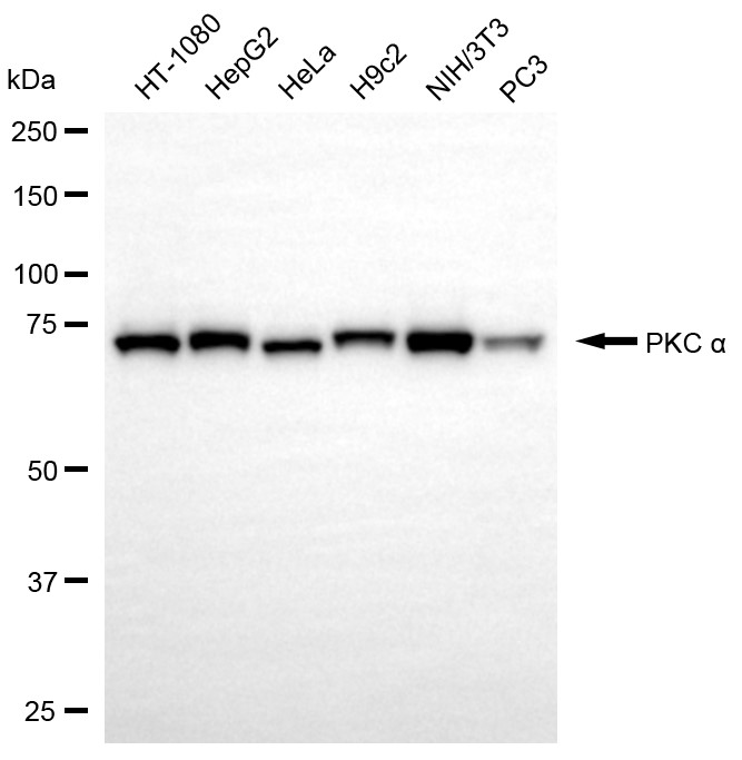 • Western blotting analysis using PKC alpha antibody. Total cell lysates (30 μg) from various cell lines were loaded and separated by SDS-PAGE. The blot was incubated with PKC alpha antibody and HRP-conjugated goat anti-rabbit secondary antibody respectively.