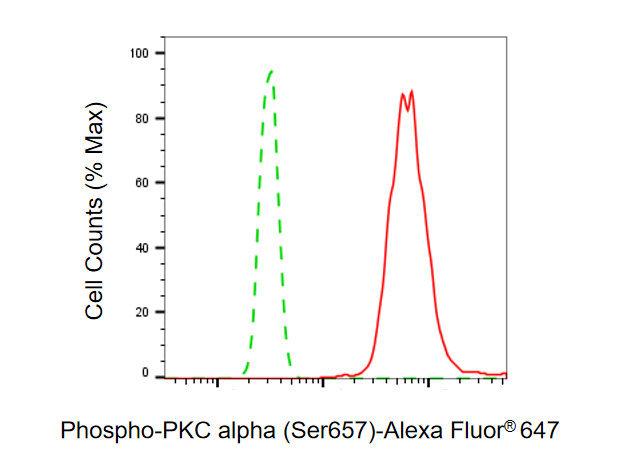 • Flow cytometric analysis of Phospho-PKC alpha (Ser657) expression in HT-1080 cells using Phospho-PKC alpha (Ser657) antibody. Green, isotype control; red, Phospho-PKC alpha (Ser657).