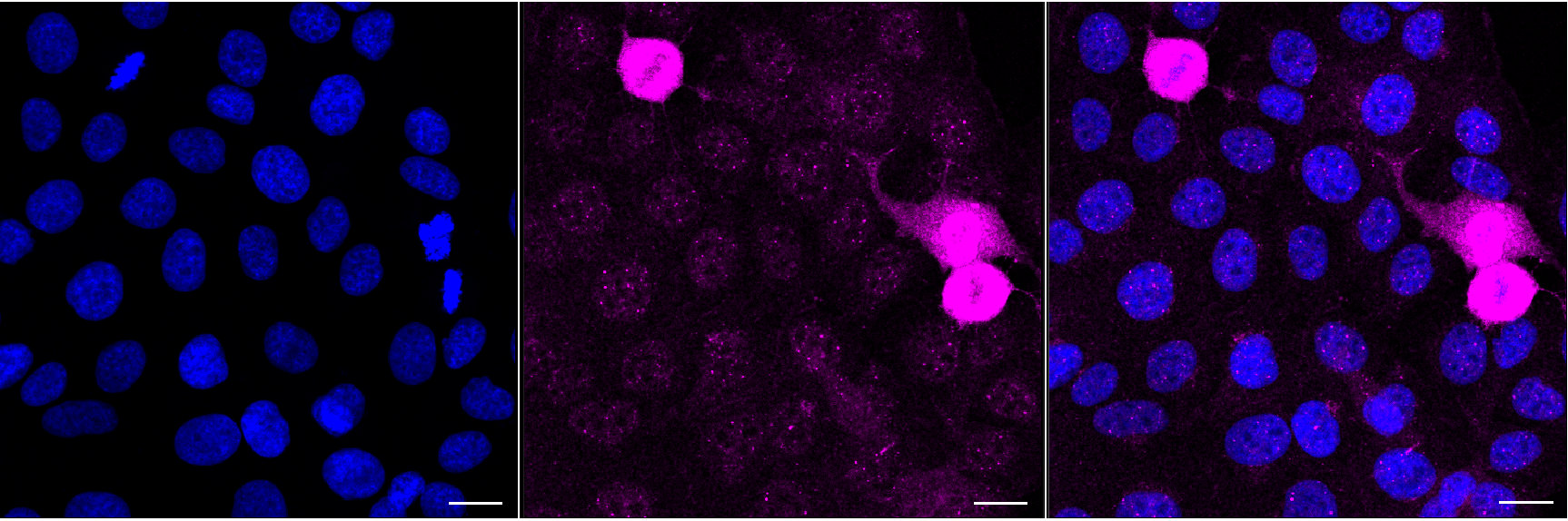 • Immunocytochemical staining of HT-1080 cells with PRKCA antibody. Nuclei were stained blue with DAPI; PRKCA was stained magenta with Alexa Fluor® 647. Images were taken using Leica stellaris 5. Protein abundance based on laser Intensity and smart gain: High. Scale bar, 20 μm.
