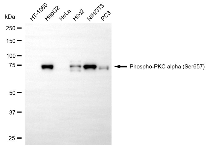 • Western blotting analysis using phospho-PKC alpha (Ser657) antibody. Total cell lysates (30 μg) from various cell lines were loaded and separated by SDS-PAGE. The blot was incubated with phospho-PKC alpha (Ser657) antibody and HRP-conjugated goat anti-rabbit secondary antibody respectively.