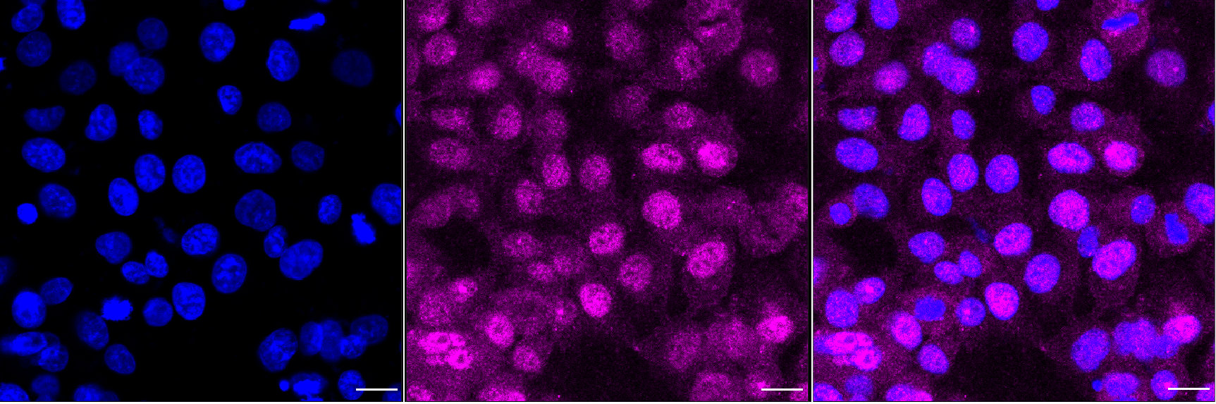 • Immunocytochemical staining of HT-1080 cells with Presenilin 1 antibody. Nuclei were stained blue with DAPI; Presenilin 1 was stained magenta with Alexa Fluor® 647. Images were taken using Leica stellaris 5. Protein abundance based on laser Intensity and smart gain: Medium. Scale bar, 20 μm.