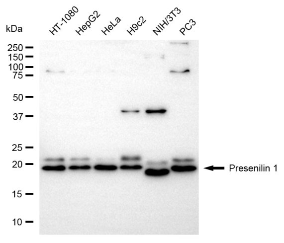 • Western blotting analysis using presenilin 1 antibody. Total cell lysates (30 μg) from various cell lines were loaded and separated by SDS-PAGE. The blot was incubated with presenilin 1 antibody and HRP-conjugated goat anti-rabbit secondary antibody respectively.