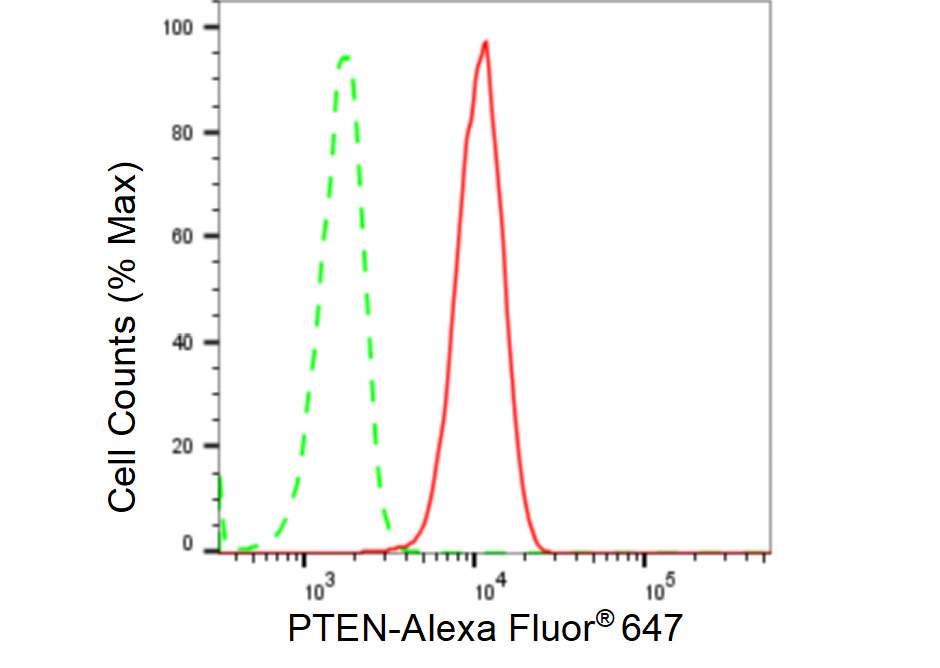 • Flow cytometric analysis of PTEN expression in C2C12 cells using PTEN antibody. Green, isotype control; red, PTEN.