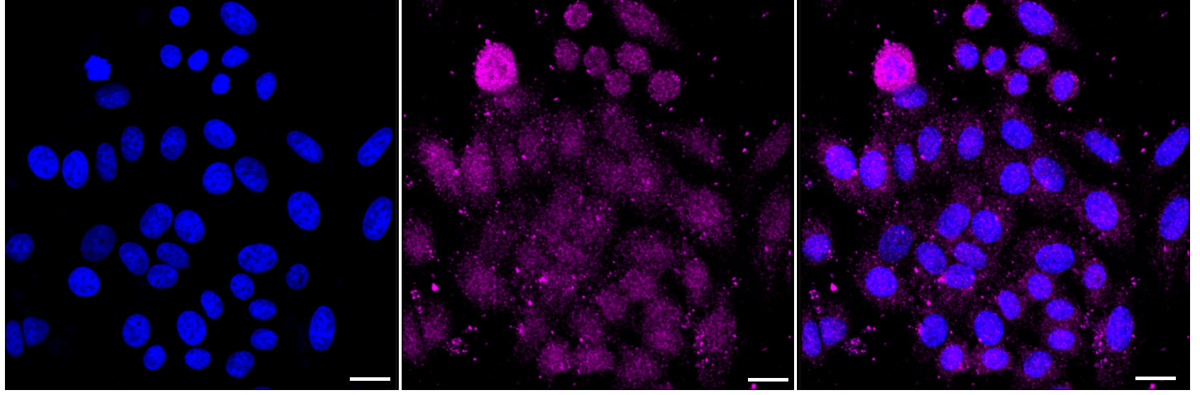 • Immunocytochemical staining of HepG2 cells with PTEN antibody. Nuclei were stained blue with DAPI; PTEN was stained magenta with Alexa Fluor® 647. Images were taken using Leica stellaris 5. Protein abundance based on laser Intensity and smart gain: Medium. Scale bar: 20 μm.