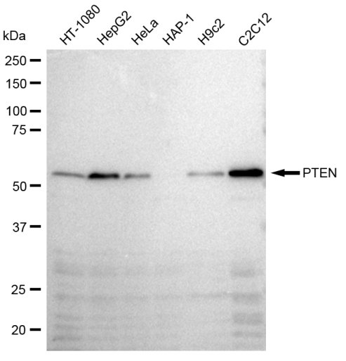 • Western blotting analysis using PTEN antibody. Total cell lysates (30 μg) from various cell lines were loaded and separated by SDS-PAGE. The blot was incubated with PTEN antibody and HRP-conjugated goat anti-rabbit secondary antibody respectively.