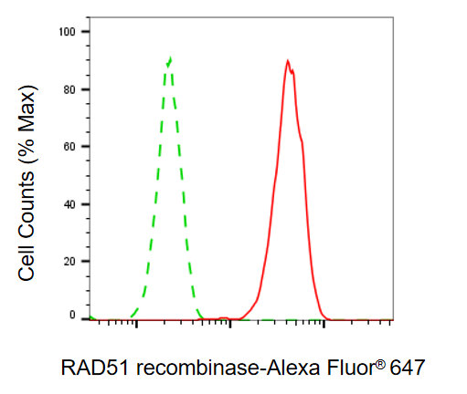 • Flow cytometric analysis of RAD51 recombinase expression in HAP-1 cells using RAD51 recombinase antibody. Green, isotype control; red, RAD51 recombinase.