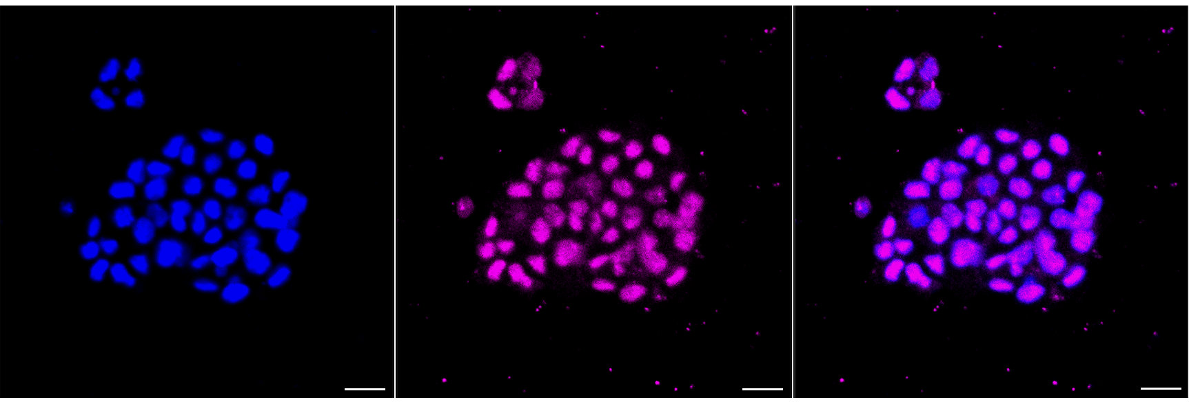 • Immunocytochemical staining of HAP-1 cells with RAD51 recombinase antibody. Nuclei were stained blue with DAPI; RAD51 recombinase was stained magenta with Alexa Fluor® 647. Images were taken using Leica stellaris 5. Protein abundance based on laser Intensity and smart gain: Medium. Scale bar, 20 μm.
