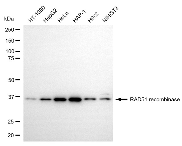 • Western blotting analysis using RAD51 recombinase antibody. Total cell lysates (30 μg) from various cell lines were loaded and separated by SDS-PAGE. The blot was incubated with RAD51 recombinase antibody and HRP-conjugated goat anti-rabbit secondary antibody respectively.
