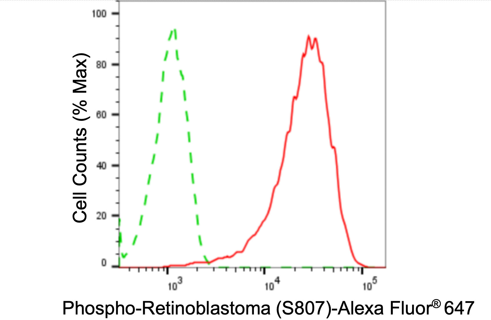 • Flow cytometric analysis of Phospho-Retinoblastoma (S807) expression in HAP-1 cells using Phospho-Retinoblastoma (S807) antibody. Green, isotype control; red, Phospho-Retinoblastoma (S807).