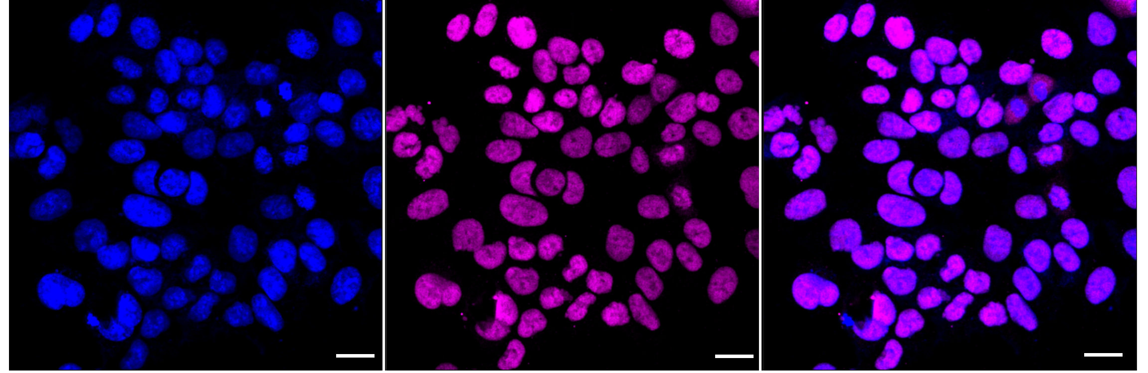 • Immunocytochemical staining of HAP-1 cells with phospho-retinoblastoma (S807) antibody. Nuclei were stained blue with DAPI; Phospho-retinoblastoma (S807) was stained magenta with Alexa Fluor® 647. Images were taken using Leica stellaris 5. Protein abundance based on laser Intensity and smart gain: High. Scale bar: 20 μm.