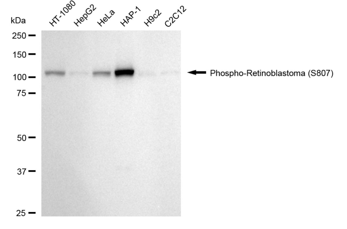 • Western blotting analysis using phospho-retinoblastoma (S807) antibody. Total cell lysates (30 μg) from various cell lines were loaded and separated by SDS-PAGE. The blot was incubated with phospho-retinoblastoma (S807) antibody and HRP-conjugated goat anti-rabbit secondary antibody respectively.