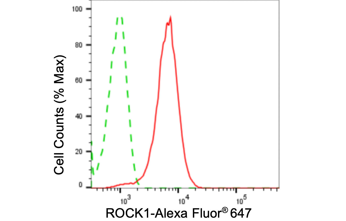 • Flow cytometric analysis of ROCK1 expression in HeLa cells using ROCK1 antibody. Green, isotype control; red, ROCK1.