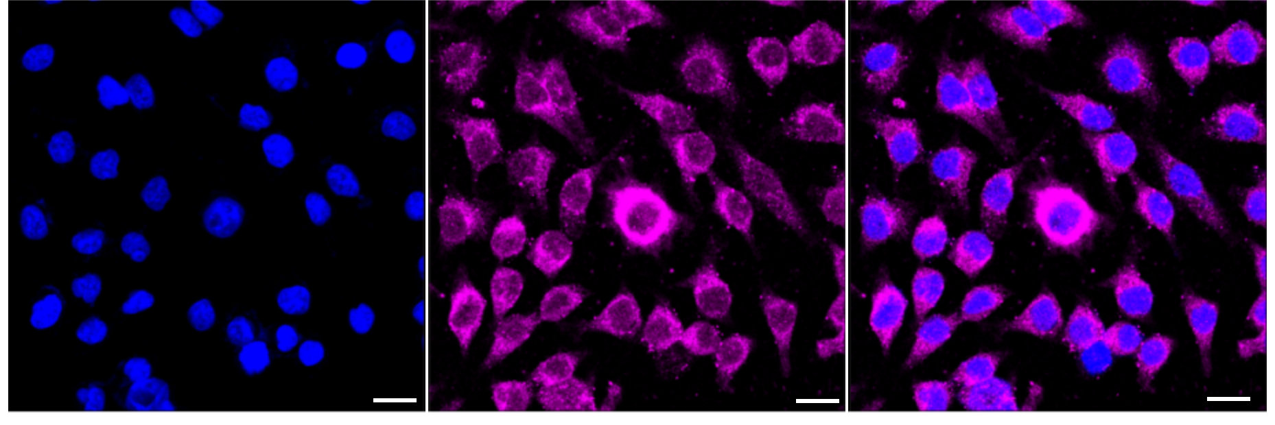 • Immunocytochemical staining of HeLa cells with ROCK1 antibody. Nuclei were stained blue with DAPI; ROCK1 was stained magenta with Alexa Fluor® 647. Images were taken using Leica stellaris 5. Protein abundance based on laser Intensity and smart gain: Medium. Scale bar: 20 μm.