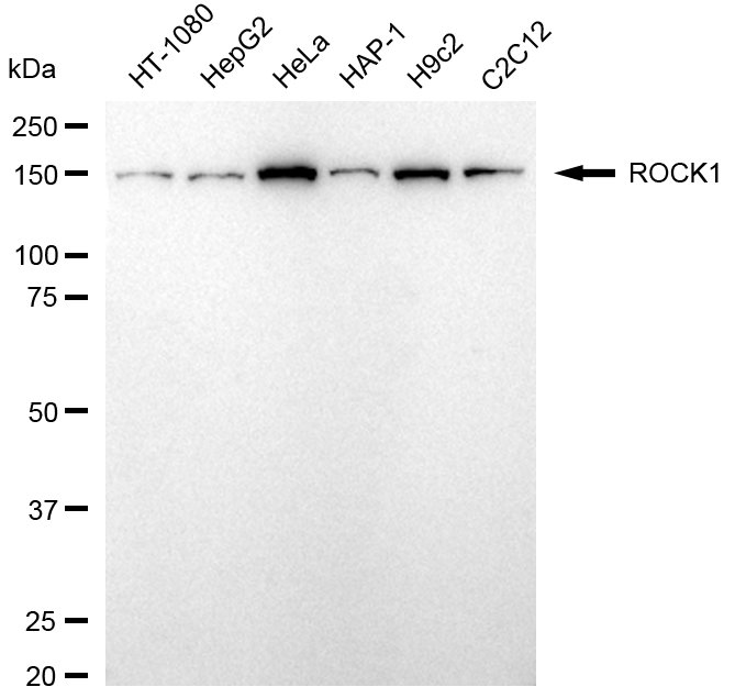 • Western blotting analysis using ROCK1 antibody. Total cell lysates (30 μg) from various cell lines were loaded and separated by SDS-PAGE. The blot was incubated with ROCK1 antibody and HRP-conjugated goat anti-rabbit secondary antibody respectively.