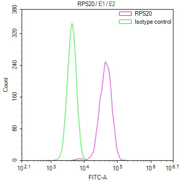 Overlay Peak curve showing jurkat cells stained with CSB-RA215735A0HU (red line) at 1:100. The cells were fixed in 4% formaldehyde and permeated by 0.2% TritonX-100 for 10min. Then 10% normal goat serum to block non-specific protein-protein interactions followed by the antibody (1ug/1*106cells) for 45min at 4℃. The secondary antibody used was FITC-conjugated goat anti-rabbit IgG (H+L) at 1/200 dilution for 35min at 4℃.Control antibody (green line) was Rabbit IgG (1ug/1*106cells) used under the same conditions. Acquisition of >10, 000 events was performed.