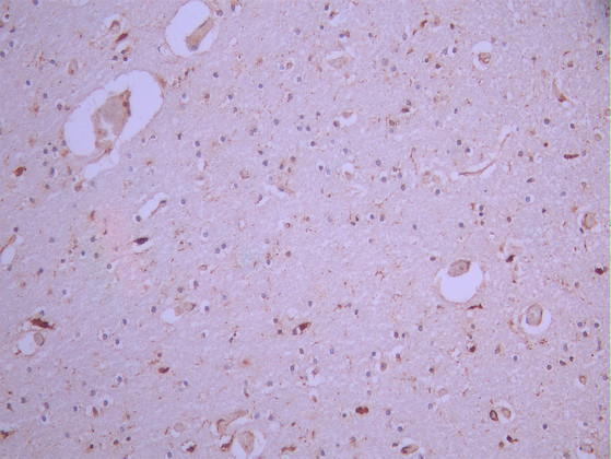 IHC image of CSB-RA215735A0HU diluted at 1:100 and staining in paraffin-embedded human brain tissue performed on a Leica BondTM system. After dewaxing and hydration, antigen retrieval was mediated by high pressure in a citrate buffer (pH 6.0). Section was blocked with 10% normal goat serum 30min at RT. Then primary antibody (1% BSA) was incubated at 4°C overnight. The primary is detected by a Goat anti-rabbit polymer IgG labeled by HRP and visualized using 0.05% DAB.