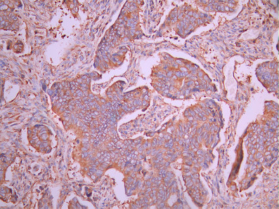 IHC image of CSB-RA215735A0HU diluted at 1:100 and staining in paraffin-embedded human colorectal cancer performed on a Leica BondTM system. After dewaxing and hydration, antigen retrieval was mediated by high pressure in a citrate buffer (pH 6.0). Section was blocked with 10% normal goat serum 30min at RT. Then primary antibody (1% BSA) was incubated at 4°C overnight. The primary is detected by a Goat anti-rabbit polymer IgG labeled by HRP and visualized using 0.05% DAB.