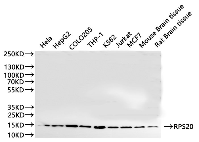 Positive WB detected in:Hela whole cell lysate(30µg), HepG2 whole cell lysate(30µg), COLO205 whole cell lysate(30µg), THP-1 whole cell lysate(30µg), K562 whole cell lysate(30µg), Jurkat whole cell lysate(30µg), MCF7 whole cell lysate(30µg), Mouse brainr tissue lysate(30µg), Rat brain lysate(30µg)