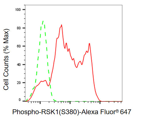 • Flow cytometric analysis of phospho-RSK1(S380) expression in HeLa cells using phospho-RSK1(S380) antibody. Green, isotype control; red, phospho-RSK1(S380).